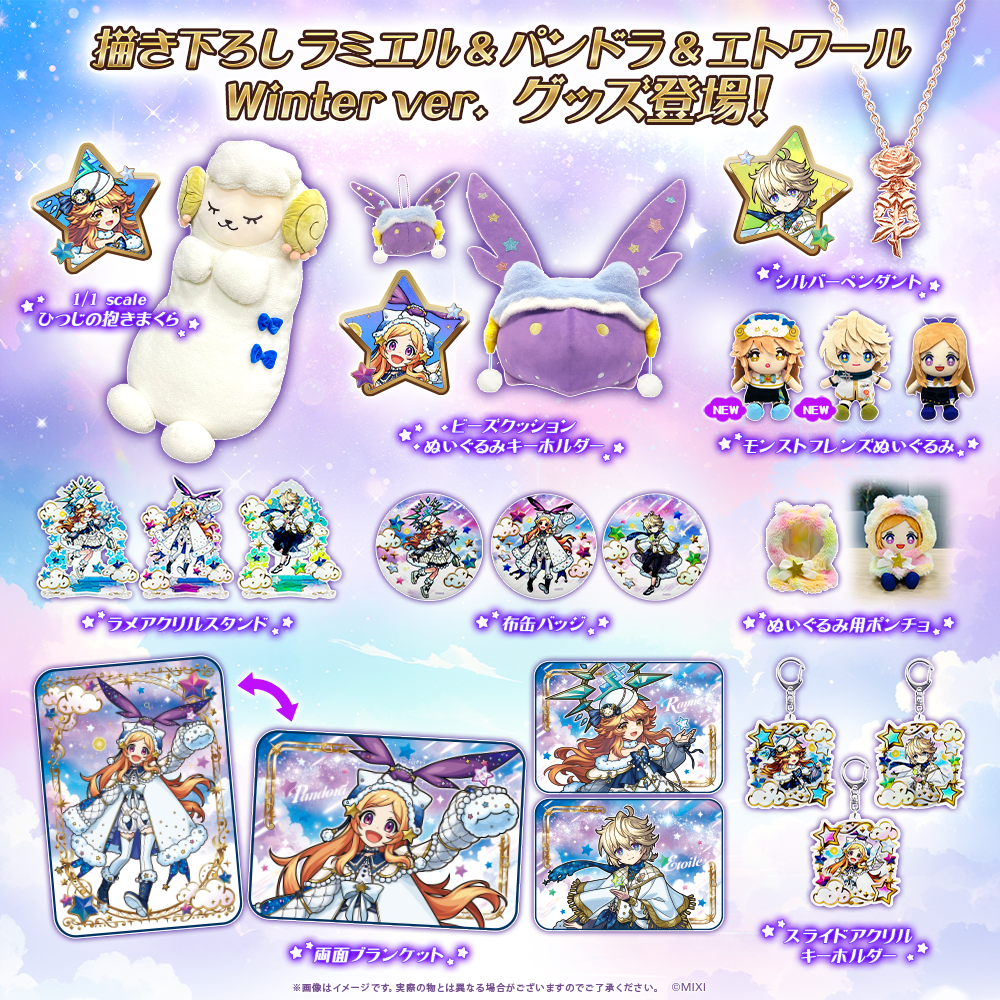 描き下ろしwinter ver.の「ラミエル」「パンドラ」「エトワール」のグッズが、「モンストア」に登場!