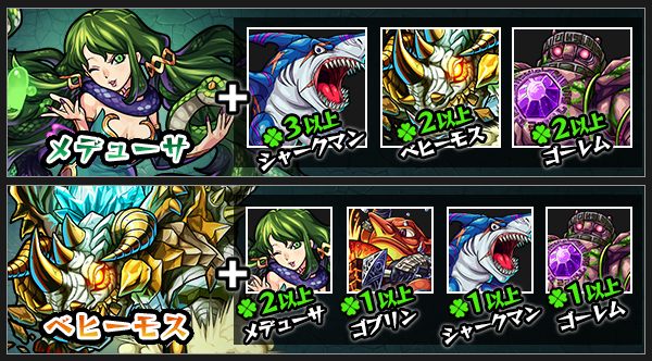 イベント 2014.11.14 NEW 11/18~ 新イベントクエストが登場! 11月18日以降、下記の新イベントクエストが登場します!クリアすると下記のモンスターが手に入るかも!?火属性 ★4 ゴブリン水属性 ★4 シャークマン木属性 ★5 メデューサ光属性 ★5 ベヒーモス◆闇属性 ★4 ゴーレム※上記の◆印キャラクターは「進化合成」で「ゲージショット」が利用可能になります。※上記の一部キャラクターで「神化合体」が可能です。【必要素材モンスター一覧】「メデューサ」「ベヒーモス」は神化合体が可能! SHARE 一覧に戻る