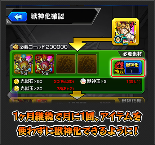 「モンパス」を購入後、1ヶ月間継続するごとに、獣神化可能なモンスターを1体、獣神化素材を使用せずに獣神化できます!