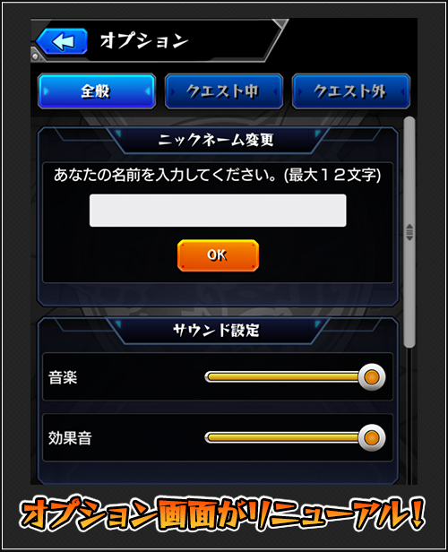 「オプション」画面では、上部に「全般」「クエスト中」「クエスト外」の3つのタブが表示され、それぞれのタブから関連する項目の設定が可能です!