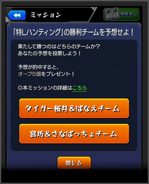 受付期間になると、ゲーム内の「ミッション」に、『「特Lハンティング」の勝利チームを予想せよ!』が表示されます。
