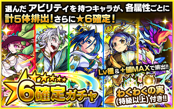「★6確定 選べる!アビリティガチャ」チケットは、4つのアビリティからいずれか1つを選択し、そのアビリティを所持するキャラクターが★6確定&さらに各属性1体ずつ計5体排出されます!