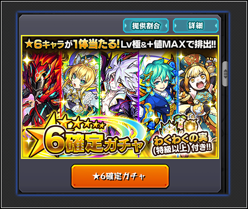 「★6確定ガチャ」は、「進化合成後(★6)」、「神化合体後(★6)」、「獣神化後(★6)」、「獣神化・改後(★6)」のいずれかの状態でキャラクターが1体確定で入手できるガチャです!