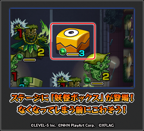 また、クエストの道中では、「妖怪ボックス」が登場!「妖怪コイン」がゲットできる!なお、「妖怪ボックス」は、一定のターン数が経過するとなくなってしまうので要注意!