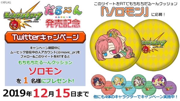 「ムービック宣伝中の人Twitterアカウント(@movic_pr)」から投稿される対象ツイートをリツイートすると、抽選で「もちもちだる~んクッション」がもらえるキャンペーンを開催!