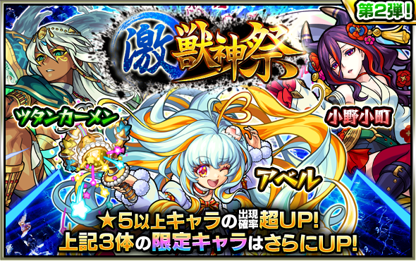 激・獣神祭限定キャラクターの「アベル」「カエサル」「ツタンカーメン」「ワタツミ」「小野小町」「弁財天」「ミロク」「ワルプルギス」「ナイチンゲール」「妲己」も排出されます!