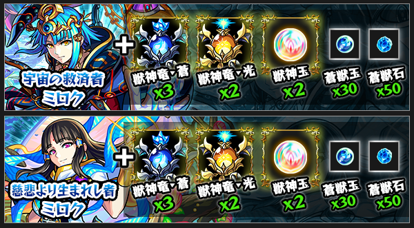 「ミロク」が「目覚めし衆生の救済者 ミロク」へ、「聖夜の救済者 ミロク」「聖夜より生まれし者 ミロク」が「目覚めし聖夜の救済者 ミロク」へ獣神化が可能になります!