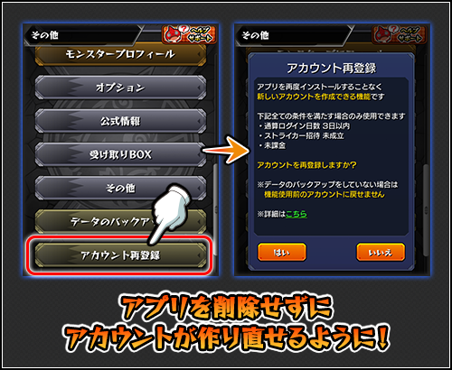 条件を満たしている場合、アプリを再度インストールせずに新しくアカウントを作り直せるようになります!