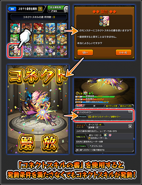 ※「コネクトスキルの書」を使用したキャラクターを素材モンスターとして強化合成しても、「コネクト解放」は継承されません。
