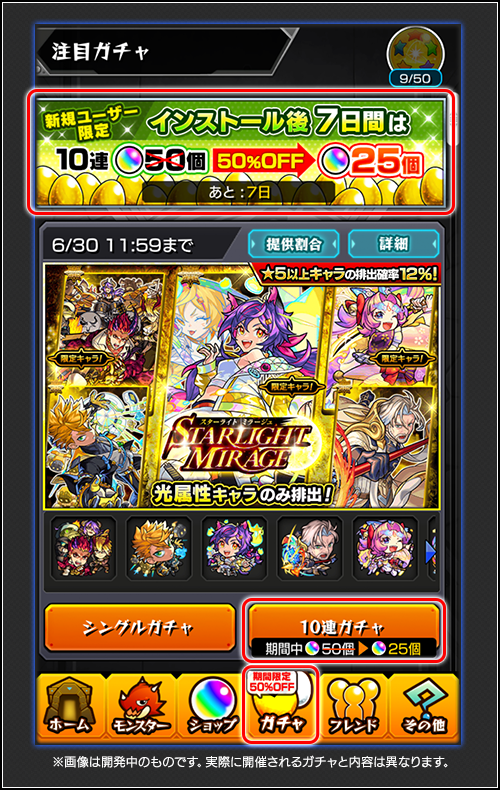 モンストに新規登録してから7日間は、通常はオーブ50個で引ける10連ガチャが、オーブ25個で引ける!