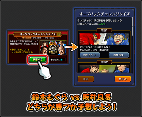 「参加する」ボタンをタップして、5つのチャレンジで「鈴木もぐら」「坂井良多」どちらが勝つか選ぼう!