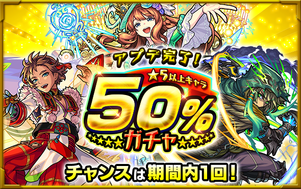 アップデートを記念した「アプデ完了!★5以上キャラ50%ガチャ」が登場!