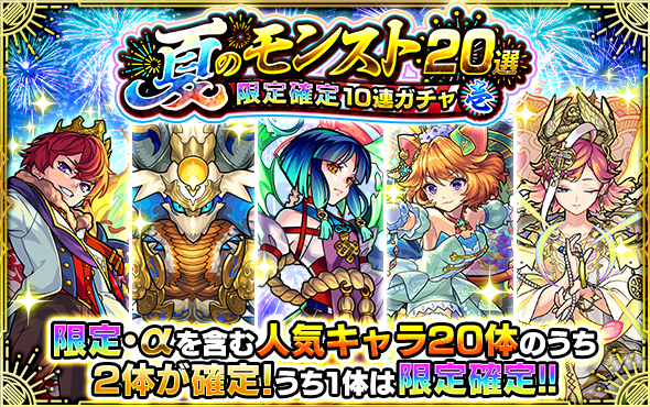 ・「夏のモンスト20選!限定確定10連ガチャ-壱-」と「夏のモンスト20選!限定確定10連ガチャ-弐-」は、今後のアップデート等で排出対象キャラクターの追加はございません。