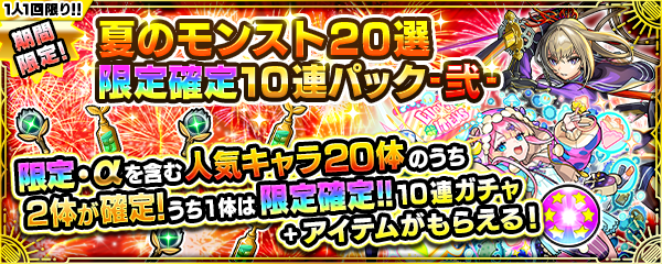 「夏のモンスト20選!限定確定10連パック-壱-」と「夏のモンスト20選!限定確定10連パック-弐-」の2つのお得なパックが期間限定で登場!