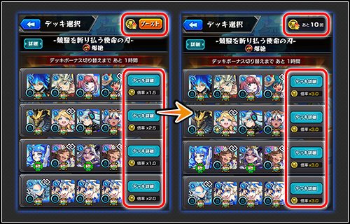 デッキ選択画面の右上にある「ブースト」ボタンからオーブ1個を消費すると、全デッキの倍率が3倍に!